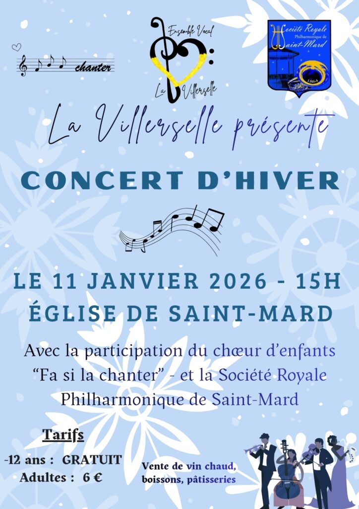 L’ensemble vocal La Villerselle vous présente son concert d’Hiver, avec la participation du choeur des enfants Fa Si La Chanter et la Société Royale Philarmonique de Saint-Mard.
